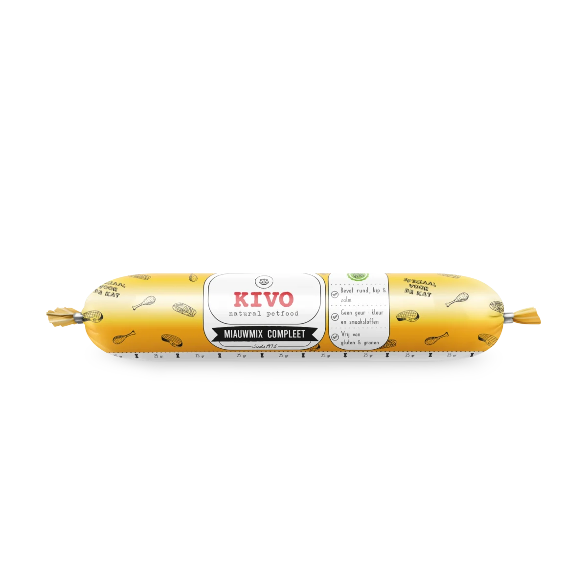 This complete meal contains all essential nutrients, cell building materials, vitamins and minerals that meet your cat’s daily needs. Said vitamins and minerals originate from natural sources, in this case beef, chicken and fatty fish. They contain high-quality ingredients, like organs: beef hearts, chicken hearts, chicken stomachs and chicken livers. Furthermore, it contains fish, muscle meat and carcass. In this meal, extra beef heart is used in order to fulfill the cat’s need for taurine. We make no use of artificial substances or chemical vitamins.