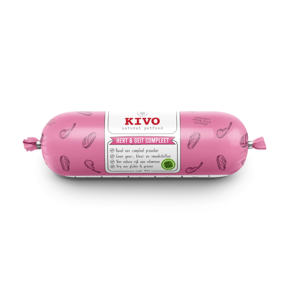 A sausage that will unlock your wild side. Our sausage makers have created this delicious blend of red meat with extreme precision. Juicy deer meat combined with the full flavor of goat meat. Our deer meat is shot in the wild and is therefore super tender. Goat meat is known for its subtly spicy notes. Put these two species together in one sausage and you have a noble meal to feed your dog. Handmade, without hassle, straight from our own factory in Veldhoven.